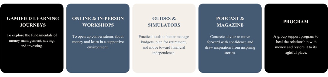 We believe that finance can be learned differently, with simplicity, curiosity, clarity, and joy. Our approach, including courses, programs, workshops, and tools, is designed to guide everyone step by step, at their own pace, without jargon or judgment. Each experience combines pedagogy, empowerment, and awareness, transforming money management into a living learning journey and fostering a calm, clear, and joyful relationship with money.